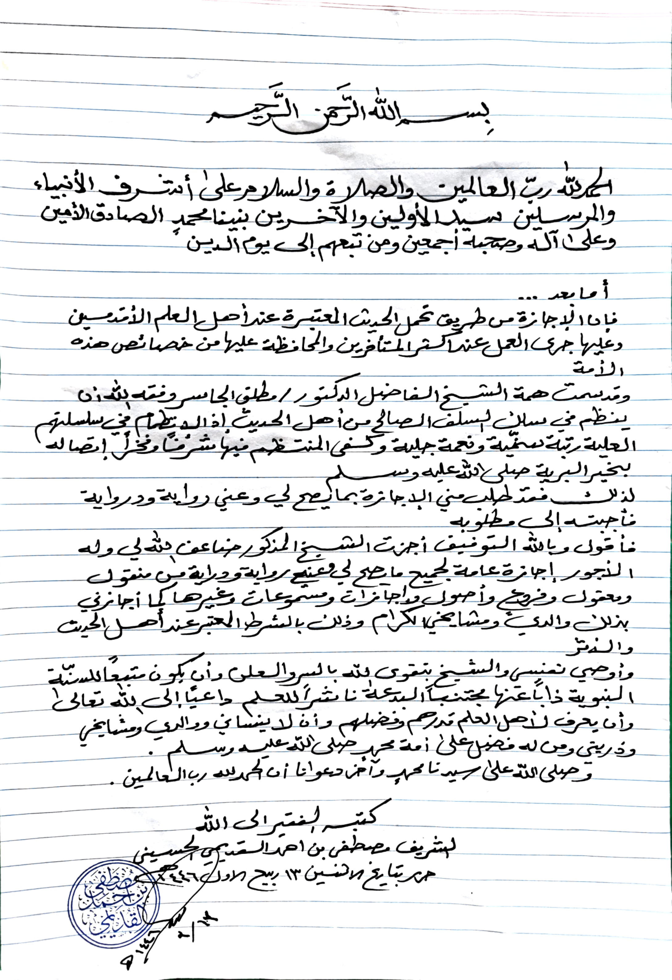 A general License was granted to him by many Islamic Scholars (Sheikhs), including: