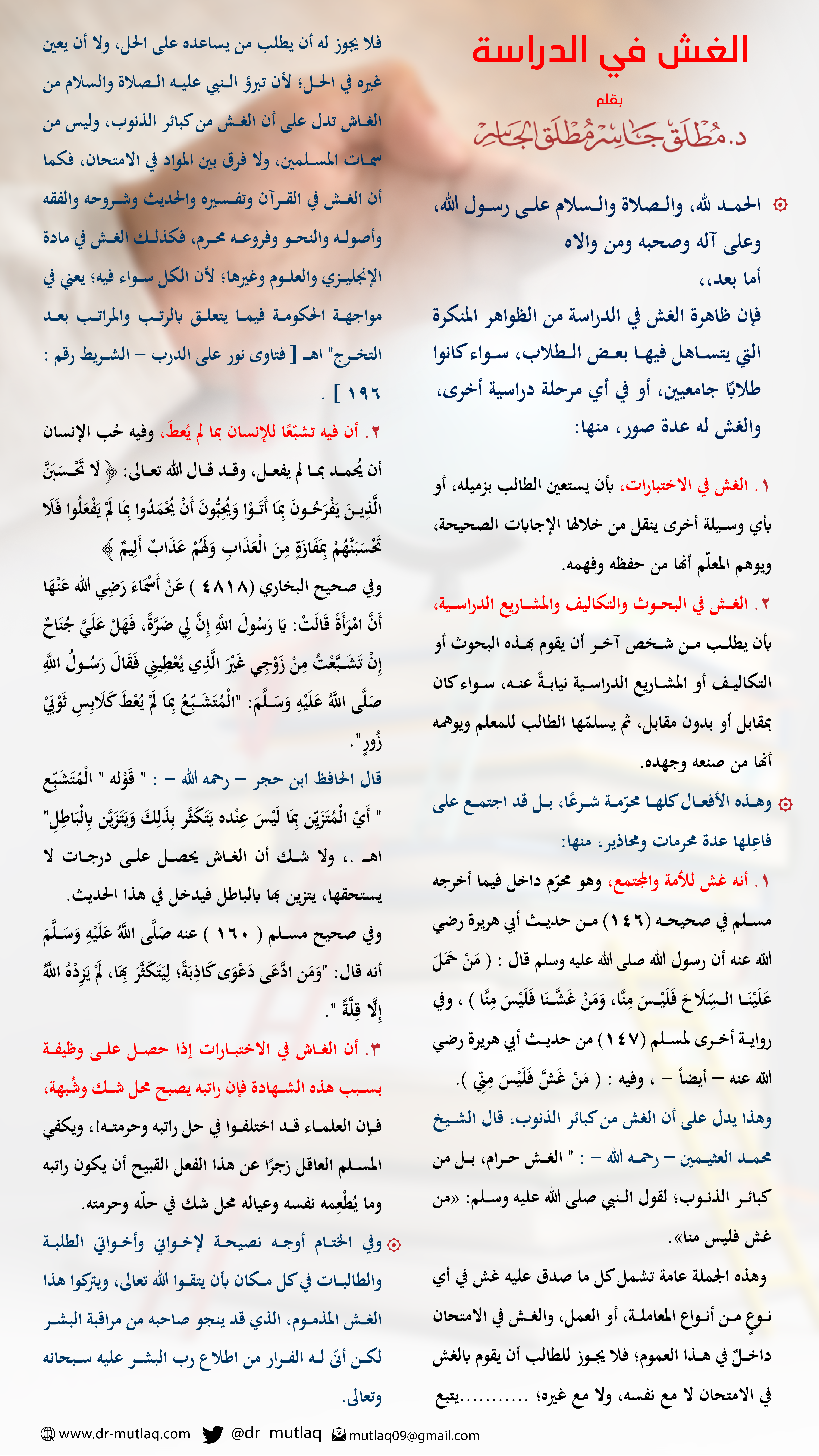 وفي الختام أوجه نصيحة لإخواني وأخواتي الطلبة والطالبات في كل مكان بأن يتقوا الله تعالى، ويتركوا هذا الغش المذموم، الذي قد ينجو صاحبه من مراقبة البشر لكن أنّى له الفرار من اطلاع رب البشر عليه سبحانه وتعالى.